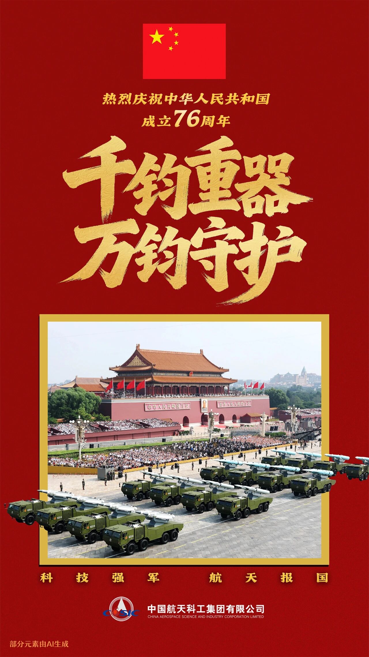 今天,中國航天人祝福偉大祖國繁榮昌盛,祝福偉大人民幸福安康。聽黨指揮,為國鑄劍,千鈞重器,萬鈞守護(hù)。(海報(bào)/張彤 文案/韓超)