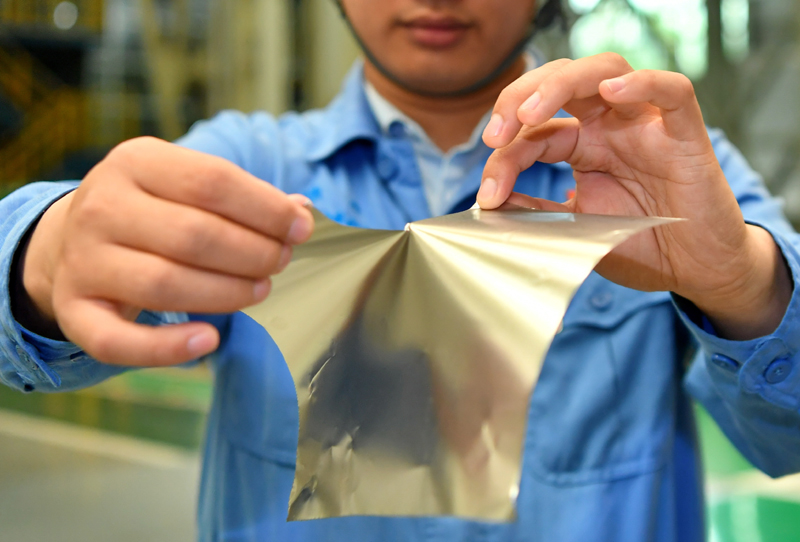 在位于山西的太鋼集團(tuán),員工展示用手撕開(kāi)0.02毫米厚的超薄帶狀不銹鋼(2019年5月24日攝)。新華社記者 曹陽(yáng) 攝