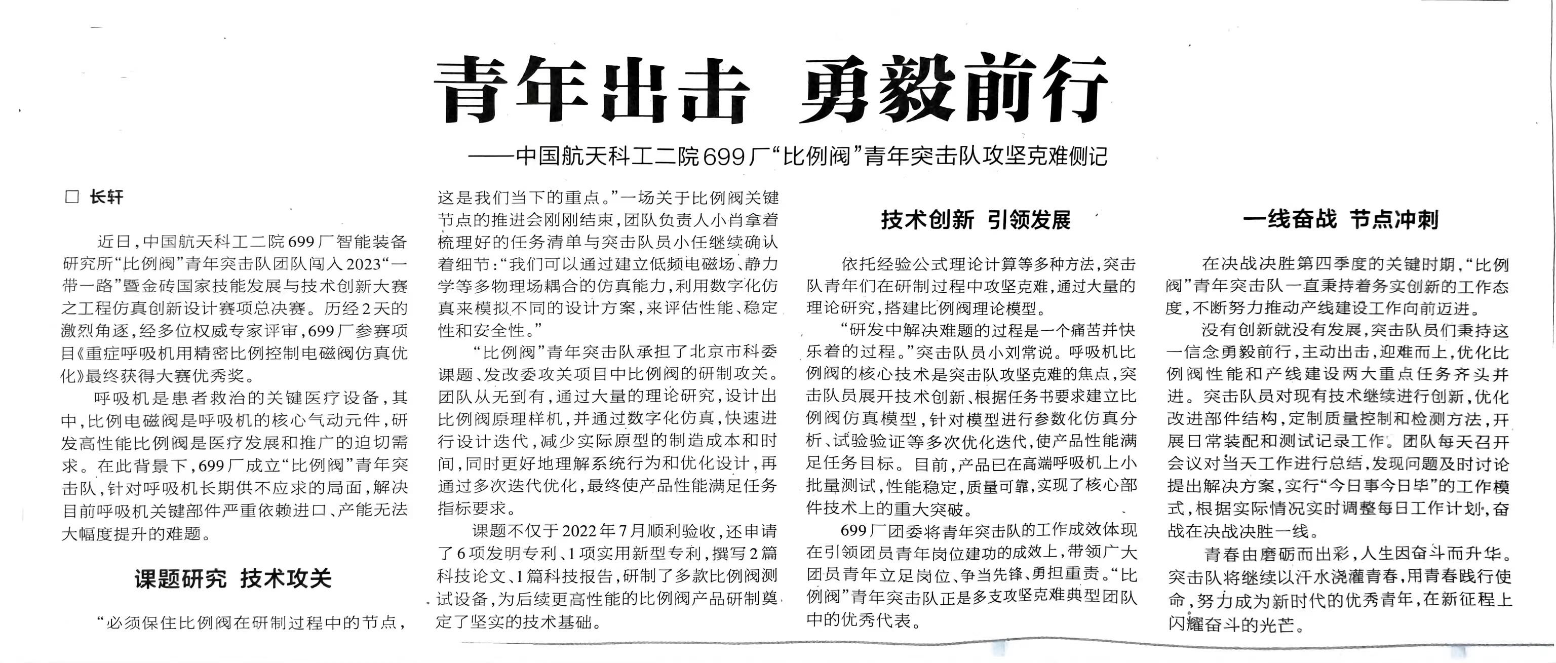 在全年科研生產(chǎn)工作中,青年突擊隊(duì)成績斐然。在全院一盤棋精神感召下,迅雷青年突擊隊(duì)大力協(xié)同,勠力力同心、努力拼搏,加班加點(diǎn),僅用4天完成兄弟單位某設(shè)備生產(chǎn)調(diào)試任務(wù),為兄弟單位在空間特殊環(huán)境中試驗(yàn)提供了有力保障;二齊青年突擊隊(duì)在承接任務(wù)過程中積極創(chuàng)新,自制工裝,研究新方法,新技術(shù),使得技術(shù)方法有了新的突破,拓寬了699廠承接任務(wù)廣度;加油桿青年突擊隊(duì)為了全力保障總體在試驗(yàn)場調(diào)試進(jìn)度,將調(diào)試任務(wù)模塊化分配,并責(zé)任到人、節(jié)點(diǎn)到天,成功配合總體完成聯(lián)調(diào);“極限沖鋒”青年突擊隊(duì)杜絕“差不多”,追求“零缺陷”,認(rèn)真梳理產(chǎn)品狀態(tài),做好工藝審查,提早發(fā)現(xiàn)問題,留出解決問題的時間,提前消除質(zhì)量隱患,為一流質(zhì)量保駕護(hù)航;“創(chuàng)新創(chuàng)效”青年突擊隊(duì)在保障生產(chǎn)任務(wù)同時,年度突破性承接15項(xiàng)課題研究工作,編制和修訂標(biāo)準(zhǔn)7項(xiàng),特殊過程確認(rèn)9項(xiàng);翱翔青年突擊隊(duì)致力于科研創(chuàng)新,依托型號任務(wù)積極開展工藝攻關(guān)與工藝細(xì)化量化工作,通過創(chuàng)新手段實(shí)現(xiàn)精細(xì)化管理,獲得2023年中國創(chuàng)新方法大賽北京賽區(qū)二等獎;“比例閥”青年突擊隊(duì)獲2023一帶一路暨金磚國家技能發(fā)展與技術(shù)創(chuàng)新大賽優(yōu)秀獎。青年突擊隊(duì)始終用青年合力為企業(yè)科研生產(chǎn)任務(wù)的高質(zhì)量完成作出了堅(jiān)強(qiáng)的保障。