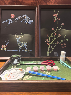 大家紛紛拿起工具,挑選心儀圖案,開啟沉浸式手工創(chuàng)作。通過精心挑選、切割螺鈿片,再將其精準(zhǔn)鑲嵌于底板之上,整個過程考驗?zāi)托呐c審美,并讓大家樂在其中。經(jīng)過一個多小時的精心制作,藍(lán)綠牡丹、火紅梅花、多彩蝴蝶等一幅幅精美獨特的螺鈿作品陸續(xù)完成,在光影下盡顯螺鈿獨有的溫潤光澤與細(xì)膩質(zhì)感。